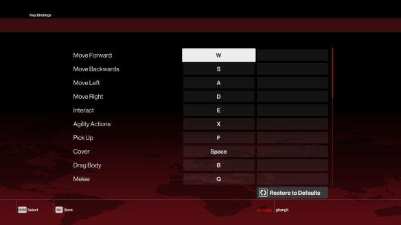 游戏中的键位可以自己随心所欲的调整,以下杀手6默认键位设置: