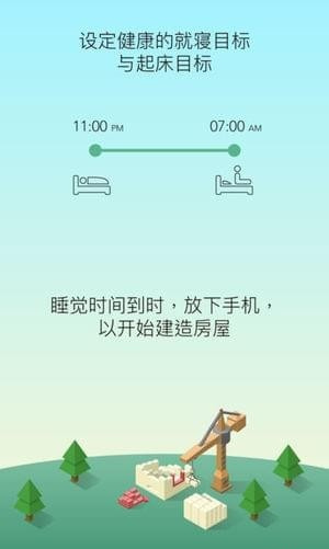 1) 设定一个有挑战性的就寝、起床时间目标;2) 每天在就寝目标时间前开启 app,开始建造房屋;