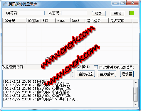 腾讯微博批量发表工具 V1.0 简体中文绿色免费版 腾讯微博批量发表工具是一款专门为腾讯qq微博推广开发的集成营销工具,通过多种微博推广方式有效传送信息。