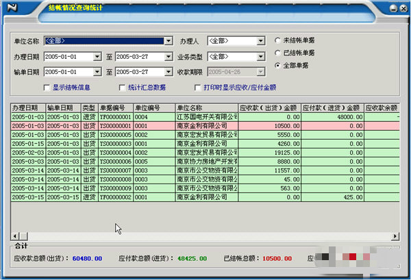 5.往来对帐 : 用于汇总核对往来单位的应收款,已收款,应付款和已付款。支持部分结帐和批结。