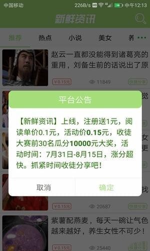 新鲜资讯,有着许多好看的新闻,视频,可以转发到朋友圈内有收入,每次单价0.15元以上,涨分快,你快来玩吧。