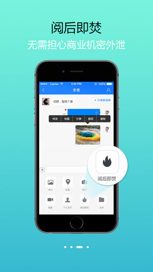 阅后即焚:机密聊天内容不可复制,不可截图,好友阅读后自动删除,无需担心泄密,可完全进行机密交流非好友临时会话:无需加好友即可方便交流,为招聘,招标,征婚等群体提供无后顾之忧的交流方式,保持距离,放心地和陌生人交流