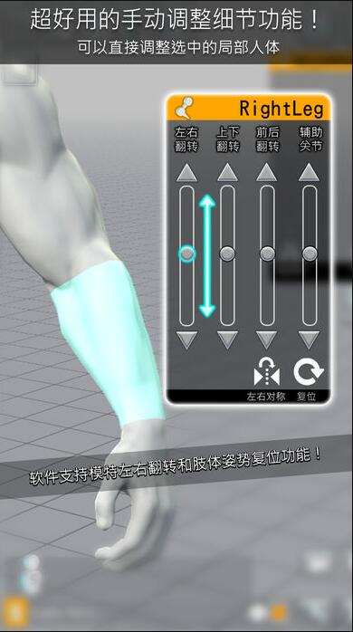 1.具体操作Easy Poser 模特所有关节都可以方便快捷地手动调节。选中的操作部分支持局部放大、局部复位、左右翻转或对称等超越一般虚拟人体app的强大功能!请您尽情体验远超鼠标操作的畅快感吧!