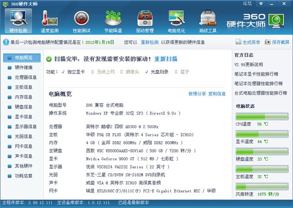 360硬件大师官方下载是一款专业易用的硬件工具,准确的硬件检测可以协助您辨别硬件的真伪,并且向您提供中文的硬件名称,让您的电脑配置一目了然,防止在购买电脑的时候被奸商蒙骗。此外360硬件大师官方下载还有温度监测、性能测试、一键电脑优化等等的功能,是您全面掌握爱机硬件配置的必备帮手。