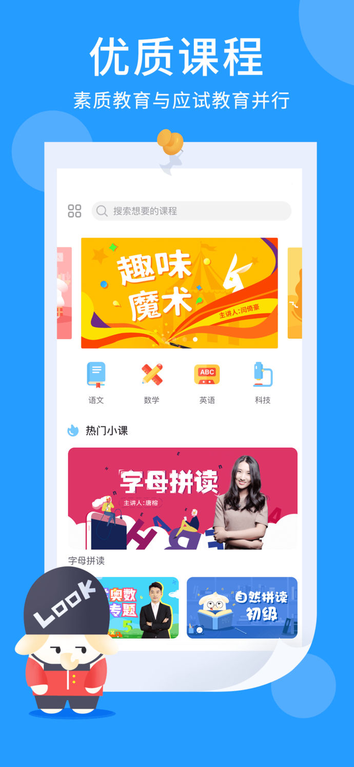 万门小学app全新产品设计,更适合孩子的亲切UI风格,万门小学课程涵盖语文、数学、英语和科技四大模块,更有课间游戏闯关,让孩子爱上学习。万门小学app让孩子懂知识会思考。