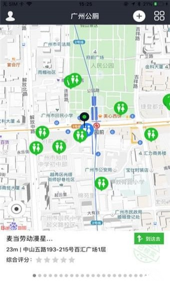 打开广州公厕App,会弹出所在位置地图,上面有系统自动查找的周边厕所。