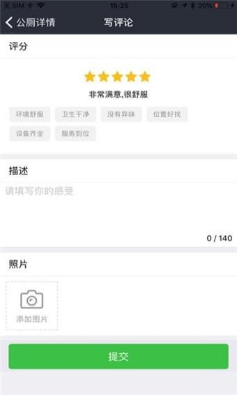 在公厕详情中,有评价栏,可以对公厕卫生、环境和气味状况进行评分,并可通过文字和照片对其进行评论描述。