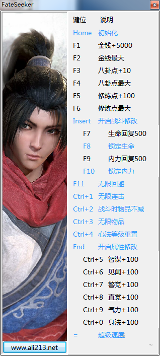1.按Esc键进入暂停菜单,进入角色咨询,然后退到游戏场景来开启初始化,进入角色咨询界面再次退至游戏场景修改金钱,八卦,修炼点数。从暂停菜单回来刷新修改后数值。2.在战斗中时,打开"开启战斗修改",并进行生命内力的相关修改。