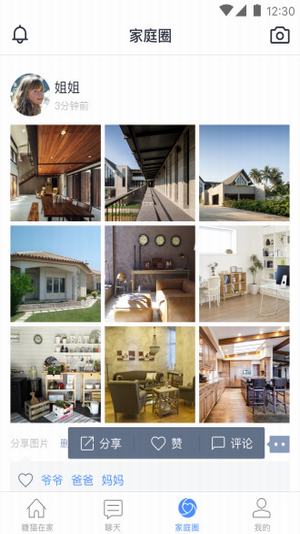 【家庭圈】基于家庭成员的社交分享空间,支持上传分享图片和视频,支持点赞和评论。