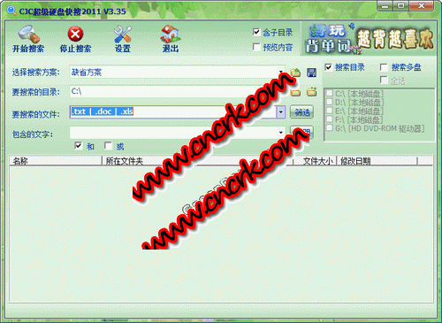 超级硬盘快搜 V3.35 简体中文绿色免费版 超级硬盘快搜是一个高速搜索自己的硬盘文件内容的工具软件,支持多个关键字搜索,就象使用google,百度一样方便,并支持各种源程序文件、txt文本文件、html文件、word文档、excel文档和rtf文档等多种文件格式,如果你愿意,还能让它去搜索一些隐藏在图片中的文字。本软件为绿色软件,不在你的硬盘上生成任何垃圾信息,而且界面直观,简单易用,现在就来google一下你的硬盘吧。这可能是你用过最实用最方便的桌面搜索软件