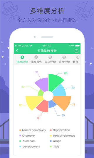 根据不同考试的评分标准,有针对性的生成多个维度的批改分析报告,老师可以实时介入学生的英语练习,加入更多的反馈信息和批改建议。