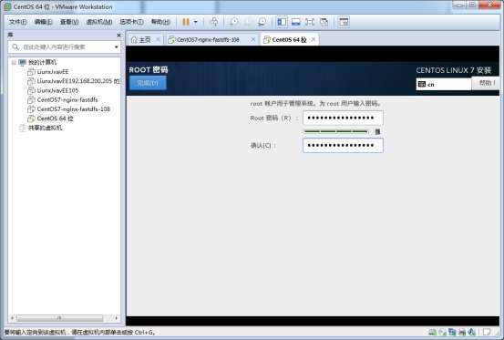 这里centos7设置密码需要数字、字母加特殊符号,它才不会报警告!点击完成就设置好root用户密码了。