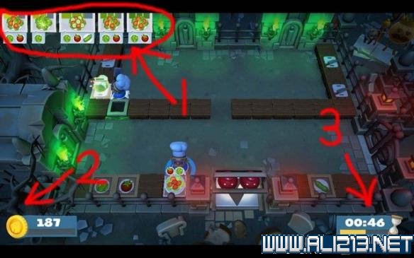 如下图箭头3所指,这里显示的是关卡时限,如果时间到了,你挣的小费没有达到标准,那么任务就会失败。