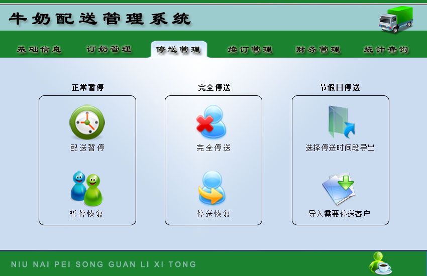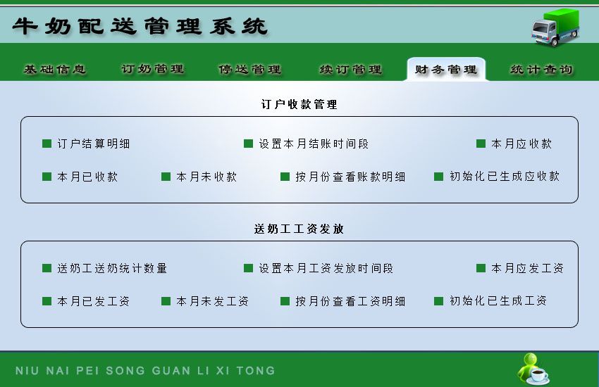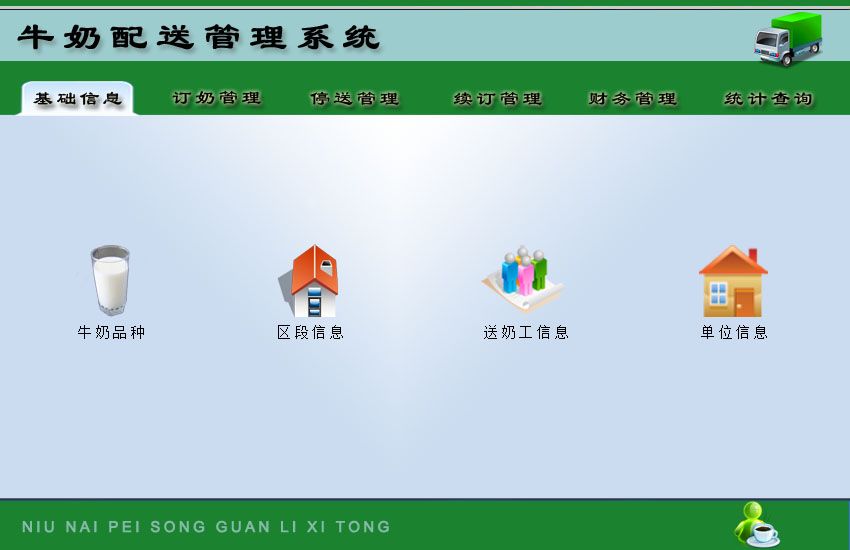 《牛奶配送管理系统》是一个协助各订奶点进行牛奶配送管理的系统,根据牛奶配送管理的实际情况,实用而科学。内容全面,分类科学。它集输入、维护、查询、筛选、统计和各种处理为一体,信息导入导出方便共享,灵活、专业的报表设计,形象、增强了数据的处理速度,《牛奶配送管理系统》是您的首选。 系统包函如下功能: 基础信息包括:牛奶品种、区段信息、送奶工信息、单位信息; 订奶管理:订户信息、今日需送奶明细、今日需送奶数量、种类更换、订单删除; 停送管理:正常停送(配送暂停、暂停恢复)、完全停送(完全停送、停送恢复)、节假日停送(选择停送时间段导出、导入需要停送客户); 续订管理:续订录入、本月续订客户、到期用户提醒; 财务管理:订户收款管理(订户结算明细、设置本月结账时间段、本月应收款、本月已收款、本月未收款、按月份查看账款明细、初始化已生成应收款); 送奶工工资发放(送奶工送奶统计数量、设置本月工资发放时间段、本月应发工资、本月已发工资、本月未发工资、按月份查看工资明细、初始化已生成工资); 统计查询:送奶工送奶统计明细、当天送奶情况、订户停送查看、统计工厂生产数量、统计区段数量、应收款明细查看。