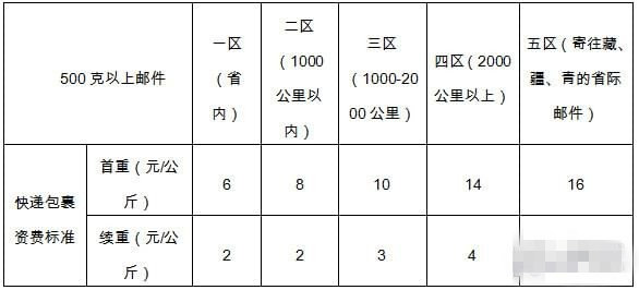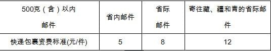(1)单件重量500克(含)以内省内5元/件,省际8元/件,寄往西藏、青海和新疆省(自治区)的省际邮件12元/件。