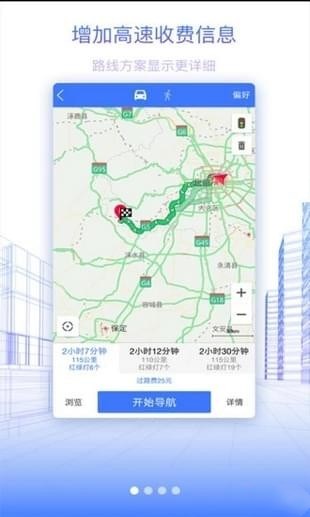 4.支持自驾车、公交、步行三种出行方式,自驾车和公交出行均提供多种出行方案。