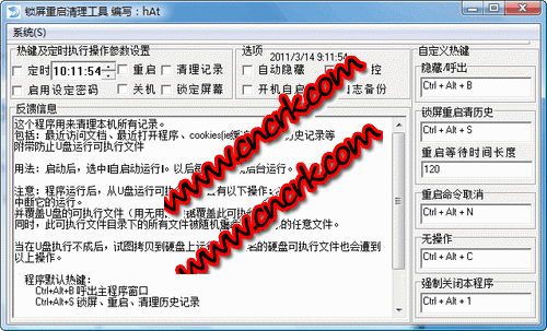 锁屏重启清理工具 用来清理本机所有记录。包括:最近访问文档、最近打开程序、cookies(ie缓冲文件)、历史记录等。附带防止u盘运行可执行文件。