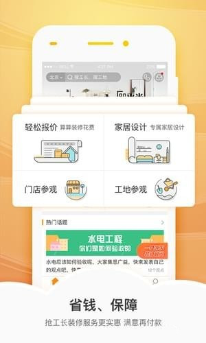 用户可以使用新浪抢工长app直接管理工地测量、建材下单、施工、智能工地监控、验收等装修事宜。
