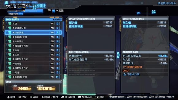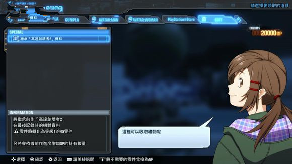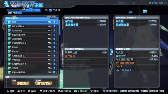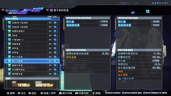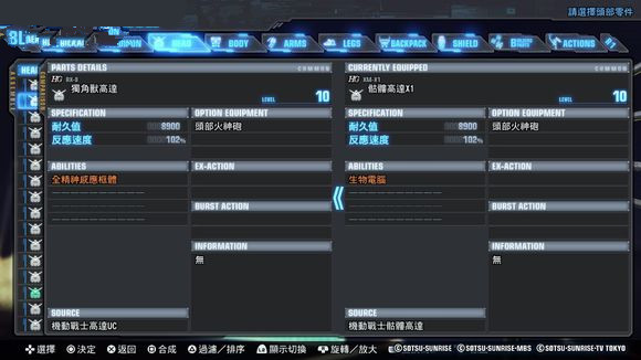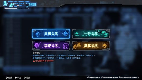 类似《高达破坏者2》的合成方式,用任务入手的Plastic或者Cube(继承、强化技能用道具)来进行合成。能使部件等级上升、强化技能、继承技能。