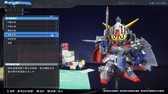 SD高达在游戏中担任玩家的辅助,只有SD高达才能使用“Model(模组)”,装备之后全队有效,有利于作战。