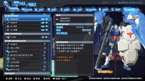 组装:编辑玩家机体部件、进行部件强化、调整EX技能和觉醒技。