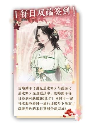 4、攻略助手《遇见逆水寒》与端游《逆水寒》深度联动,攻略助手每天签到可获赠200红尘!同时可一键将本服务器同一通行证下所有端游角色的本日签到全部完成!