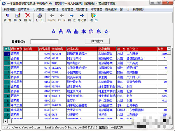 1、功能超强的独创模糊查询与字典功能。药品可以按药品编号、拼音码、药品名称、药品类别、药品剂型、生产厂家等多种方式进行模糊查询,开创国内医院信息管理软件的先河,大大方便了您的操作,使您更容易的检索到您需要查询的内容。2、界面采用电子表格风格,操作简单、易上手,图形化工具栏按钮,让您操作自如;所有单据完全按手工填单模式设计,立体显示,空间感强;