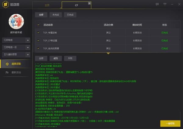 活动帮是一款免费的游戏活动装备领取工具,支持CF活动领取、dnf活动领取、lol活动领取,还支持其他多个热门游戏的活动道具领取。活动帮是全网最专业的游戏活动领取助手,最新游戏活动及时通知,让你不错过任何一个活动;道具领取活动一键领取,减少繁杂的操作,让你轻松领取免费道具。【软件特点】