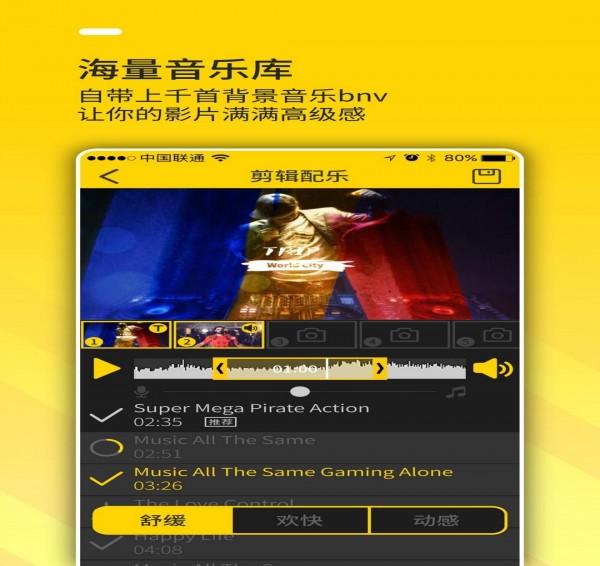 【商业音乐库】:自带海量商业视频配乐,每个视频模板都会推荐30首风格不同的背景音乐,保证不重样!配合音乐剪辑——视频加音乐,优美旋律的音乐相册立马呈现;