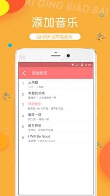 1.音乐伴奏:随意选择本地音乐。2.添加图片:点击添加相册图片和照片。