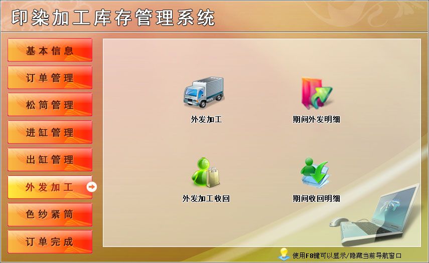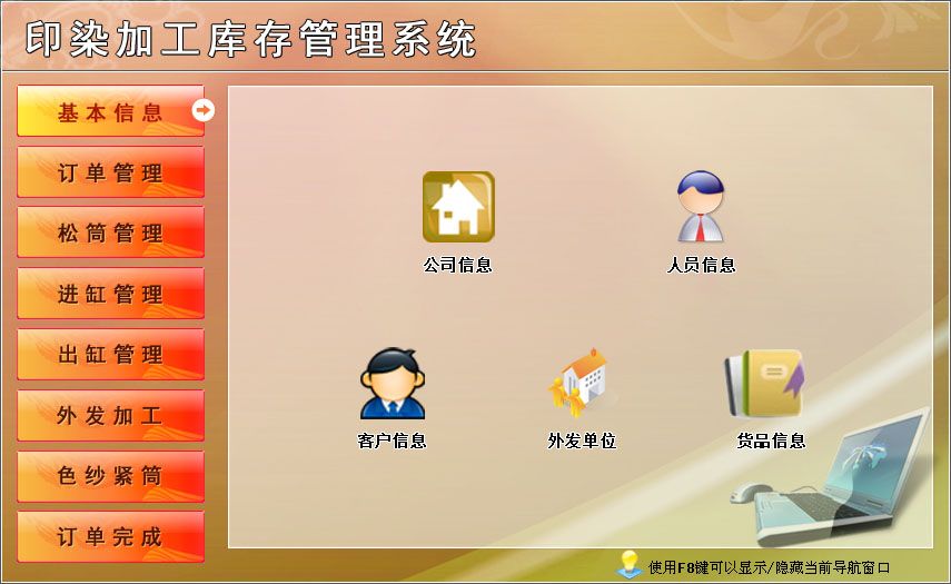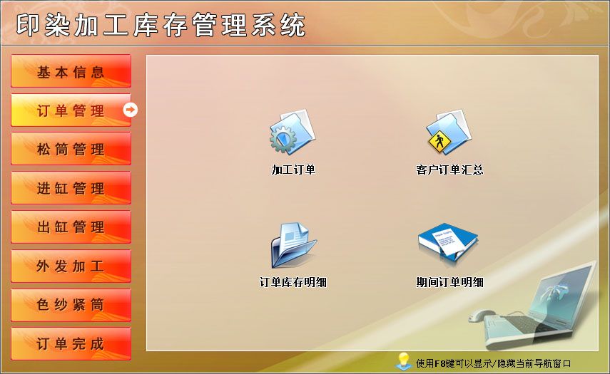一、基本信息:公司信息、人员信息、客户信息、外发单位、货品信息二、订单管理:加工订单、客户订单汇总、订单库存明细、期间订单明细