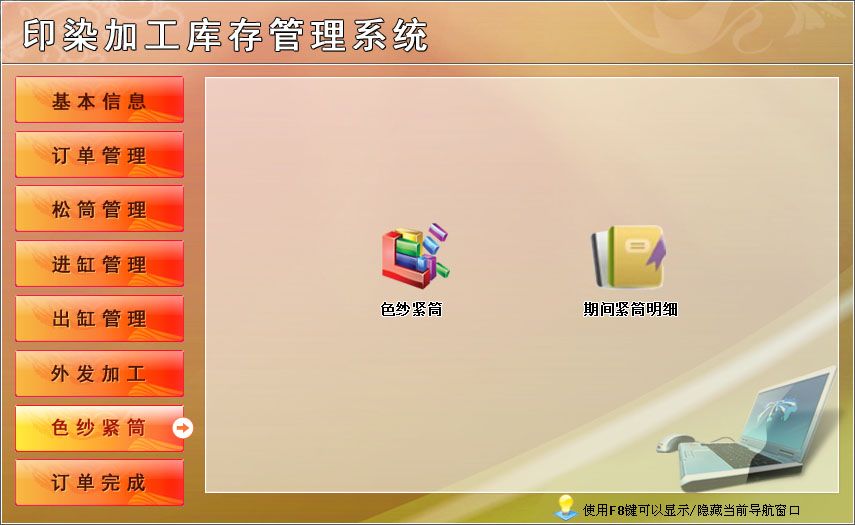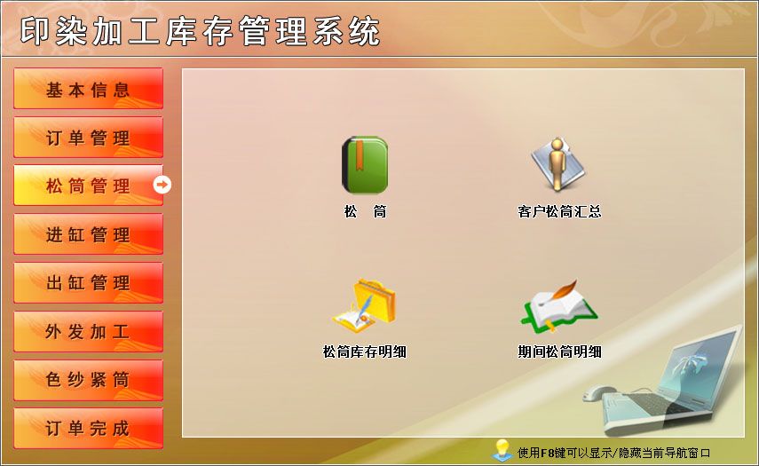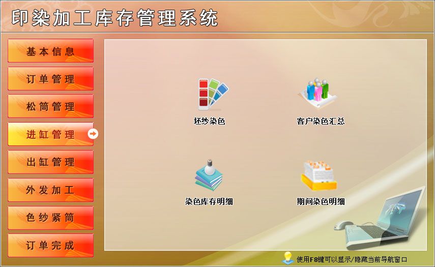 《印染加工库存管理系统》适用于中小型印染场加工企业的管理软件。主要包基本信息、订单管理、松筒管理、进缸管理、出缸管理、外发加工、色纱紧筒等功能。本管理系统多处具有快速辅助录入功能,操作简单,易学、易用;处理功能高效强大,是协助您的好帮手!