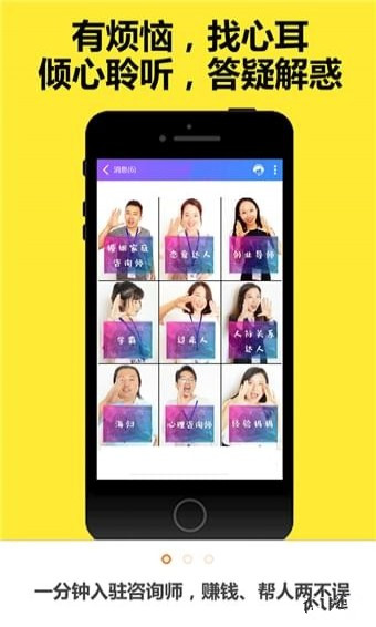 心耳在线app,C2C综合服务,凝聚各领域专业的咨询师,帮助我们解决生活和工作、情感等所遇到的各种问题,共享过来人智慧的结晶,减少我们要走的弯曲路径。现如今,我们在生活,工作,家庭,婚姻,健康,美容,法律,职业,教育,创业,技能等很多领域会遇到一些这样或者那样的问题,每当碰到这样问题,我们会四处来搜索相关答案或者求助专业人士等。但各种机构混乱不堪,良莠不齐,一个问题就需要访问一个平台,浪费时间浪费精力,而心耳切实app的解决了这个问题,在这一个平台上,你可以咨询任何问题。