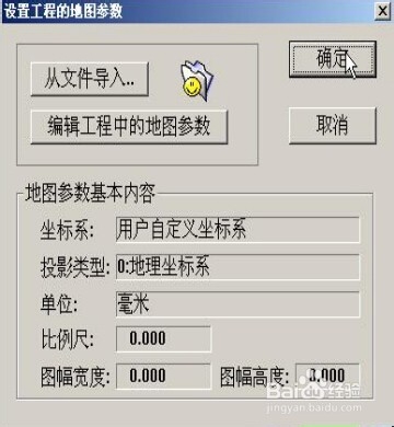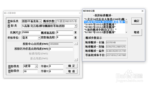 单击原始投影参数。坐标系类别选择投影平面直角,椭球参数选择西安80/1975,投影类型选择高斯-克吕格{横切椭圆柱等角}投影,比例尺分母选择输入25000,坐标单位选择毫米,椭球面高程为0m,投影带类型为六度带,投影带序号为18。点击确定
