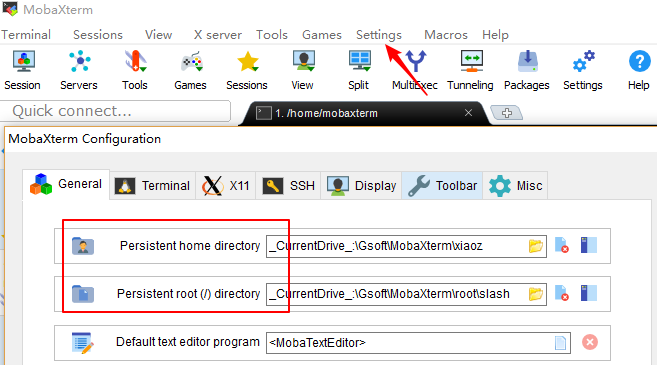 MobaXterm会产生临时文件,但是临时文件随时可能被删除或丢失,建议指定文件夹作为/home和/目录,以免出现异常。打开Settings – Configuration – Genernal进行设置,如下截图。
