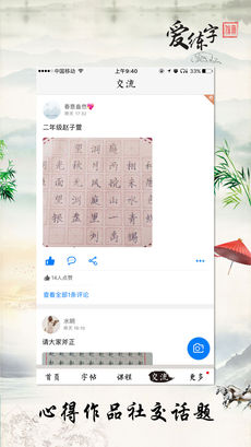 6、书法同好话题交流:社交功能互动不断,快来跟同好一起交流书写心得,展示练字作品,引爆话题讨论。