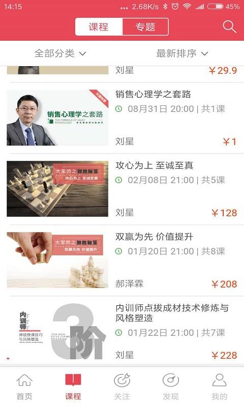 1、「直播课程」细分到全行业的直播课程,邀请全国明星讲师、大咖机构在线授课。做到名师直播,智趣乐享。2、「专题课程」整合优质的直播课程,成套的组合课程,让你的职业学习更加系统。