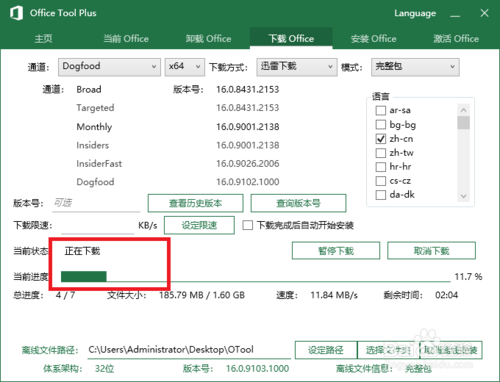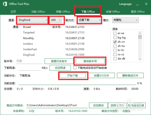 2、然后双击Office Tool Plus.exe工具。在打开的页面中选择下载office。通道选择Dogfood,版本选择x64,下载方式一般是选择迅雷下载,如果出错的话就使用aria2下载。然后点击查询版本号,最后再点击开始下载。