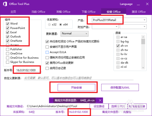 4、下载完成后,我们在点击下载工具上的安装Office,在左边组件栏里选择需要安装的组件,然后在序列号那里将原来的ProPlusRetail修改为ProPlus2019Retail