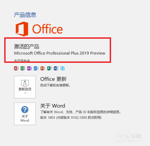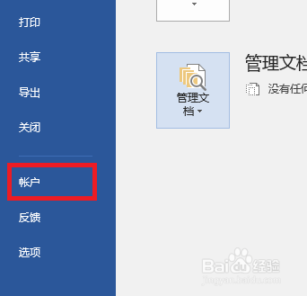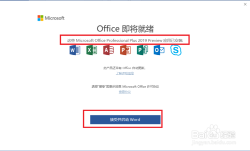 7、点击接受并启动,然后就会进入到word界面,我们打开一个word文档。点击左上角的文件,然后点击账户,就能看到office的版本以及激活信息了。office2019是自动激活的。