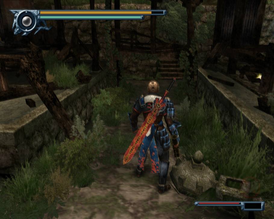 一直想大门斩去,但大门被封死无法通过,剧情强制二人来到桥下,一直沿途来到尽头再次爬上岸,发生战斗,限时一分钟解决拿斧子的幻魔,时间绝对充裕(我用了5秒23……),从门旁边的梯子上去到了尽头,这里有个存盘点,在从另一个梯子上去,这是梯子被打断,需要苍鬼从另一边打开门才可以,再次限时战斗,同样没有难度,建议用鬼力攻击,在进入刚才的门,来到桥下,解决一些小兵和门上的家伙,通过小桥,咔嚓了那个半路杀出来的程咬金,门左边取得道具有存旁点,在门右边场景二层取得钥匙,回来进入刚才小桥边上那上锁的门,杀死所有敌人,在箱子中取得[寺之文章 右] 回到上一个场景进入中间的门,将六盏灯打亮,然后再灯下取得[寺之文章 左],进入被封印的大门发生BOSS,这个家伙的头很硬,推荐绕到后方打他的PP,BOSS得攻击方式比较简单,注意见好就收,轻松过关。