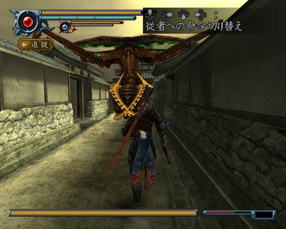 鬼武者共同携手抗敌,本作的从者系统将这一优良传统发扬光大。吸收了一些其他游戏的特点,从者系统将十字键的四个方向定义为向从者下达四种命令。它们分别为:↑(全力猛攻)、↓(待机防御)、←(特殊行动)、→(平常跟随)。在这其中,不同的从者其特殊行动也有不同的效果。苍鬼是吸魂、茜是向敌人挑衅、阿初是援护射击、罗伯特是狂战士化、天海是吟唱提升攻击力的咒语。除了向从者下达命令外,玩家还可以在主角苍鬼和从者之间按L2进行切换。在连续攻击敌人的时候,由于可以切换角色随时接力,那么单一角色的硬直时间也就不存在了。战略就得到了无限的扩大!除此之外,从者系统也是流程中解迷的必要手段。针对各个角色不同的特殊技能,可以解开不同的迷题。茜是钻过狭缝和小洞、阿初是飞跃和爆破、天海则是超度亡魂。