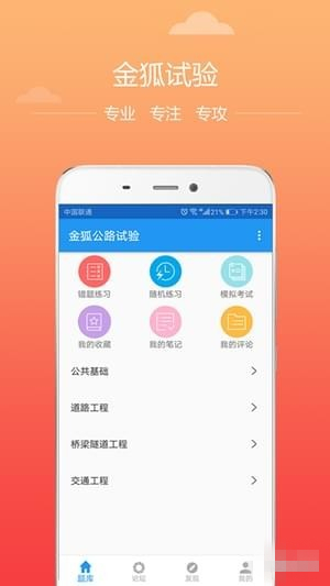 金狐公路试验app是一款公路水运工程试验检测考试APP,金狐试验软件作为公路试验行业的首款模拟考试答题软件,始终秉承着“创新研发、客户为主”的原则,带动试验检测行业考试的健康发展、稳固推进,勇做行业领头羊。