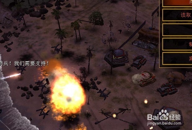 主要攻略:开始有一艘航母和两艘战舰,两架直升机。先用雷达探岸边的,再用军舰沿岸边一直打下去,战舰射程远!!我基本上都是用它灭掉敌人的!一艘向上,一艘同下,注意先打防空车和防空兵,因为三级的防空车可以好厉害的!!当灭了岸边的敌人后,就会有两架汗马和两个尖兵,一些美国兵,一架远射的火炮,最后会有贝顿,用航母上的F18灭了毒刺导弹旁的坦克,再用尖兵帮助,航母再攻,一直打下去!敌人全歼!过关!!!
