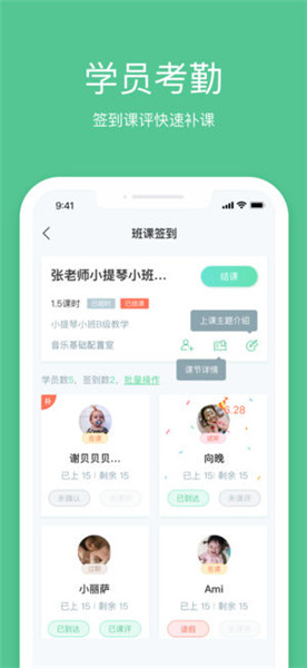 学员签到:以当日课节为单位,即时查看学员到课详情。