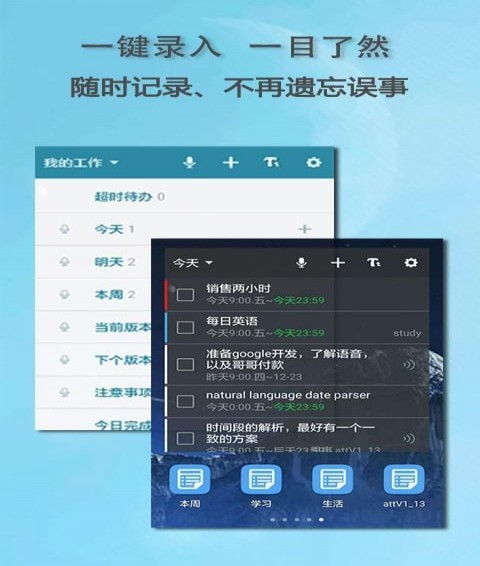 .一键语音录入,智能解析时间、提醒,非常便捷。.标签、标签组、日历等各类事情列表,可按自己的需要灵活组合。
