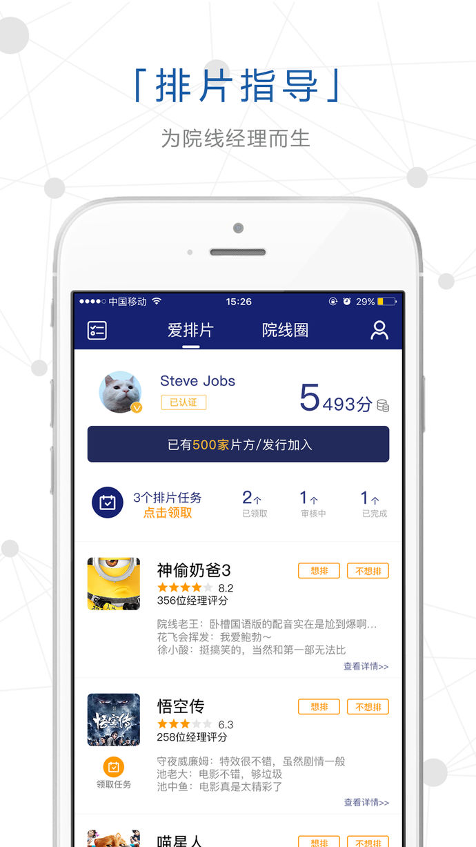 爱排片是一款用于片方与院线之间动态进行排片的现代智能APP。APP中分为两种角色,片方和院线经理。先由片方发布影片排片任务,包括排片周期,院线等级要求,排片量,积分奖励等,之后院线方根据自身条件选择性接受任务,并每天上传排片凭证,在片方审核通过之后,可获得相应积分奖励。