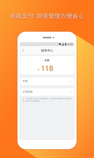 配送费统一线上支付,方便安全,商家可在账户中心进行充值。