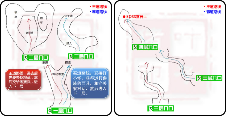 雪居士副本路线分2条,一条是王道路线一条是霸道路线