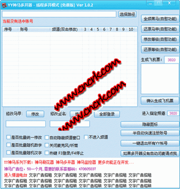 无限yy多开[不掉线]、自动登陆、自动进频 自动改名、自动改签名、自动闭麦/听筒 一键退出所有yy号、半自动注册yy号